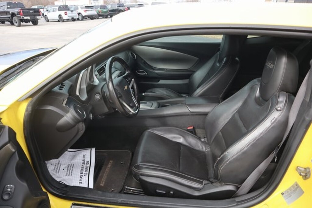 Bright Yellow 2014 Chevrolet Camaro SS 2SS RWD 6-Speed Automatic with TapShift 6.2L V8 SFI 2 Front Cup Holders, 20" x 8" Front & 20" x 9" Rear Aluminum Wheels, 3-Spoke Leather-Wrapped Steering Wheel, 4-Wheel Antilock 4-Wheel Disc Brakes, Air Conditioning, AM/FM Stereo w/Navigation, Analog Instrumentation, Auto-dimming door mirrors, Auto-dimming Rear-View mirror, Auxiliary Multi-Function Gauges, Body-Color Roof Ditch Molding, Boston Acoustics Premium 9-Speaker Audio System, Brake assist, Bumpers: body-color, Cargo Net, Carpeted Front Floor Mats, Color Display Driver Information Center, Compass, Delay-off headlights, Driver door bin, Driver vanity mirror, Electric Rear-Window Defogger, Electronic Cruise Control, Electronic Stability Control, Exterior Parking Camera Rear, Front fog lights, Front reading lights, Fully automatic headlights, Garage door transmitter, Head-Up Display, Heated door mirrors, Heated Driver & Front Passenger Seats, Heated front seats, High-Intensity Discharge Headlamps, Illuminated entry, LATCH System, Leather Shift Knob, Leather-Wrapped Shift Knob, Maintenance-Free Battery, Manual Rake & Telescopic Steering Column, OnStar 6 Months Directions & Connections Plan, Outside temperature display, Panic alarm, Passenger door bin, Passenger vanity mirror, Power door mirrors, Power passenger seat, Power Programmable Door Locks, Power Sunroof w/Express-Open & Venting, Preferred Equipment Group 2SS, Premium Carpeted Floor Mats, Rear Spoiler, Rear window defroster, Remote Keyless Entry, RS Package, Security system, Separate Daytime Running Lamps, SiriusXM Satellite Radio, Speed control, Speed-sensing steering, Spoiler, StabiliTrak, Stainless-Steel Dual-Outlet Exhaust, Steering Wheel Mounted Audio Controls, Tachometer, Telescoping steering wheel, Tilt steering wheel, Traction control, Trip computer, Universal Home Remote, USB Port Audio System Feature, Voltmeter.