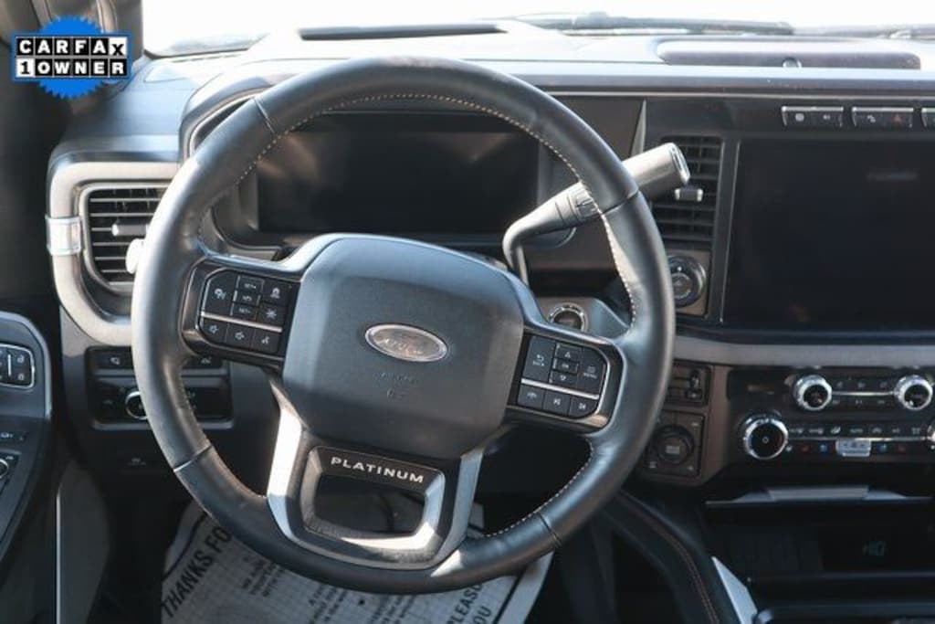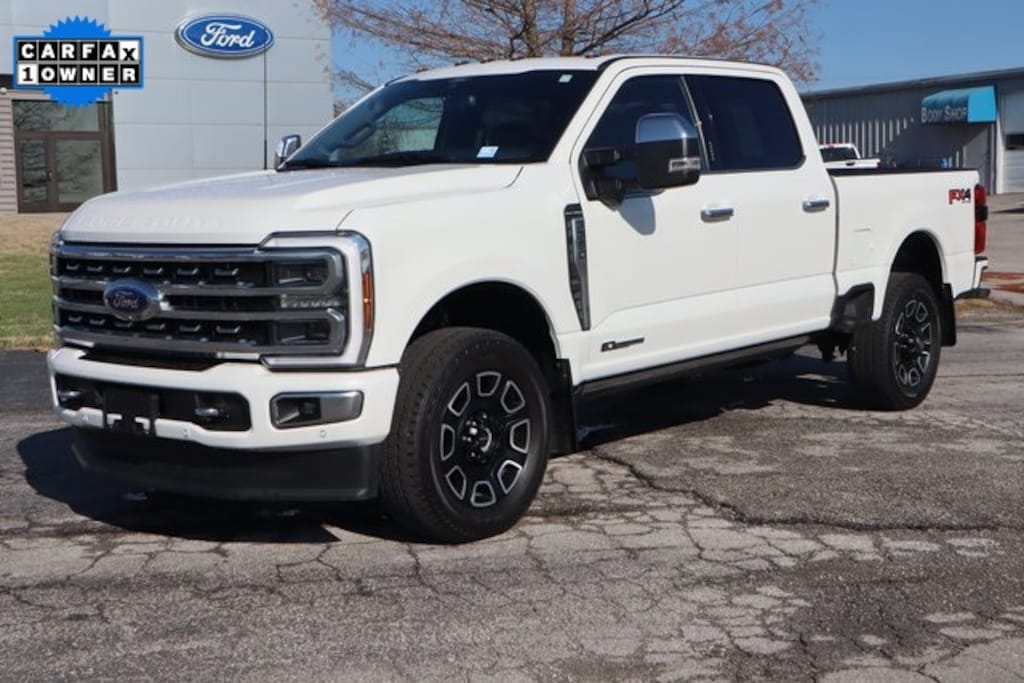 White Metallic 2024 Ford F-350SD Platinum 4WD 10-Speed Automatic Power Stroke 6.7L V8 DI 32V OHV Turbodiesel 4WD, 5th Wheel/Gooseneck Hitch Prep Package, Adjustable pedals, Air Conditioning, Auto High-beam Headlights, Auto tilt-away steering wheel, Auto-dimming Rear-View mirror, Automatic temperature control, Brake assist, Compass, Driver door bin, Driver vanity mirror, Electronic Stability Control, Electronic-Locking w/3.31 Axle Ratio, Engine Block Heater, Flow-Through Console, Front Bucket Seats, Front Center Armrest, Front dual zone A/C, Front fog lights, Front License Plate Bracket, Front reading lights, Front Splash Guards/Mud Flaps (Pre-Installed), Fully automatic headlights, FX4 Off-Road Package, Garage door transmitter, Gooseneck Hitch Kit (Pre-Installed), Heated door mirrors, Heated front seats, Heated rear seats, Heated steering wheel, Hill Descent Control, Illuminated entry, LED Roof Clearance Lights, Low tire pressure warning, Max Recline Seats, Memory seat, Navigation system: Connected Navigation (includes complimentary 1-year trial), Off-Road Specifically Tuned Shock Absorbers, Order Code 713A, Outside temperature display, Overhead console, Panic alarm, Passenger door bin, Passenger vanity mirror, Pedal memory, Power door mirrors, Power driver seat, Power passenger seat, Power steering, Power windows, Radio: B&O Unleashed Sound System by Bang & Olufsen, Rain sensing wipers, Rapid-Heat Supplemental Cab Heater, Rear reading lights, Rear seat center armrest, Rear Splash Guards/Mud Flaps (Pre-Installed), Rear step bumper, Rear window defroster, Remote keyless entry, Security system, SiriusXM Radio w/360L, Speed control, Split folding rear seat, Steering wheel memory, SYNC 4 w/Enhanced Voice Recognition, Tachometer, Telescoping steering wheel, Tilt steering wheel, Tough Bed Spray-In Bedliner, Traction control, Trip computer, Turn signal indicator mirrors, Twin Panel Power Moonroof, Unique FX4 Off-Road Box Decal, Variably intermittent wipers, Ventilated front seats.