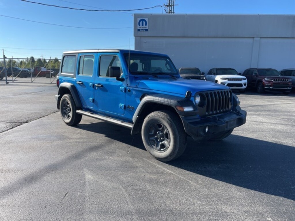Hydro Blue Pearl Coat 2022 Jeep Wrangler Unlimited Sport 4WD 8-Speed Automatic 2.0L I4 DOHC 240 Amp Alternator, 3.45 Rear Axle Ratio, 7 & 4 Pin Wiring Harness, 700 Amp Maintenance Free Battery, Air Conditioning, Apple CarPlay/Android Auto, Auxiliary Switches, Black 3-Piece Hard Top, Brake assist, Class II Receiver Hitch, Compass, Delay-off headlights, Driver door bin, Driver vanity mirror, Electronic Stability Control, Engine Oil Cooler, Freedom Panel Storage Bag, Front Bucket Seats, Front Center Armrest w/Storage, Front fog lights, Front reading lights, Low tire pressure warning, Mopar Black Fuel Filler Door, Mopar Black Tubular Side Steps, MOPAR Satin Black Grille, No Soft Top, Normal Duty Suspension, Outside temperature display, ParkView Rear Back-Up Camera, Passenger door bin, Passenger vanity mirror, Power steering, Quick Order Package 22B Sport, Radio: Uconnect 4 w/7" Display, Rear reading lights, Rear Window Defroster, Rear Window Wiper/Washer, Speed control, Steering wheel mounted audio controls, Stop-Start Dual Battery System, Tachometer, Telescoping steering wheel, Tilt steering wheel, Traction control, Trailer Tow & HD Electrical Group, Trip computer, Variably intermittent wipers, Wheels: 17" x 7.5" Black Steel Styled.