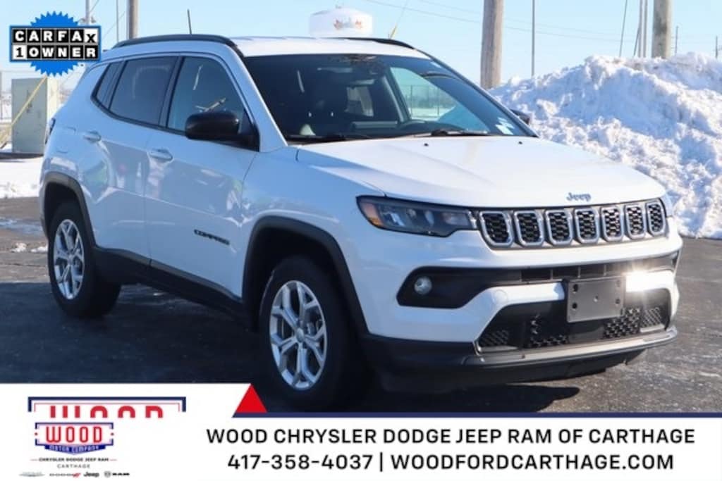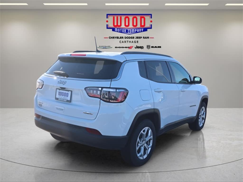 Bright White Clearcoat 2024 Jeep Compass Latitude 4WD 8-Speed Automatic 2.0L I4 DOHC 4WD, 17" x 7" Aluminum Wheels, 3.73 Final Drive Ratio, Air Conditioning, Auto High-beam Headlights, Brake assist, Bumpers: body-color, Compass, Delay-off headlights, Driver door bin, Driver vanity mirror, Electronic Stability Control, Four wheel independent suspension, Front Bucket Seats, Front fog lights, Front License Plate Bracket, Front reading lights, Fully automatic headlights, Heated door mirrors, Illuminated entry, Leather Shift Knob, Leather steering wheel, Low tire pressure warning, Outside temperature display, Overhead console, Panic alarm, ParkView Rear Back-Up Camera, Passenger vanity mirror, Power door mirrors, Power steering, Power windows, Premium Cloth/Vinyl Bucket Seats, Quick Order Package 29J Latitude, Rear seat center armrest, Rear window defroster, Rear window wiper, Remote keyless entry, Security system, Steering wheel mounted audio controls, Tachometer, Telescoping steering wheel, Tilt steering wheel, Trip computer, Variably intermittent wipers.