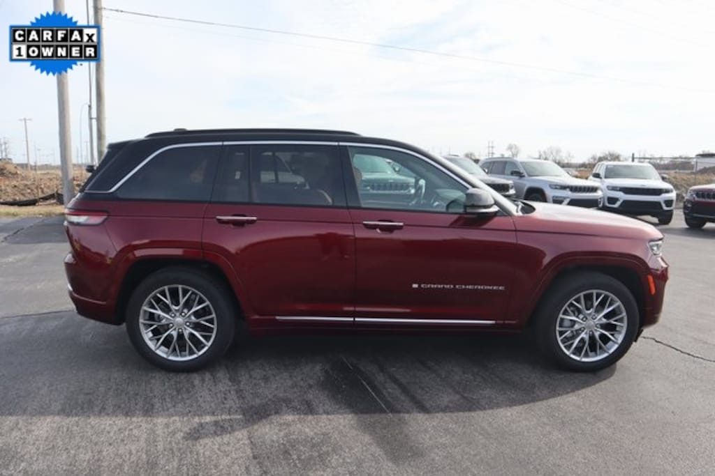 Velvet Red Pearlcoat 2024 Jeep Grand Cherokee Summit 4WD 8-Speed Automatic 3.6L V6 24V VVT 4WD, Auto High-beam Headlights, Auto-dimming door mirrors, Auto-dimming Rear-View mirror, Automatic temperature control, Brake assist, Bumpers: body-color, Compass, Delay-off headlights, Driver door bin, Driver vanity mirror, Electronic Stability Control, Front Bucket Seats, Front Center Armrest w/Storage, Front dual zone A/C, Front reading lights, Fully automatic headlights, Heated door mirrors, Heated front seats, Heated rear seats, Heated steering wheel, Illuminated entry, Leather steering wheel, Low tire pressure warning, Memory seat, Nappa Leather Seats, Navigation System, Normal Duty Suspension, Outside temperature display, Overhead console, Panic alarm, Passenger door bin, Passenger vanity mirror, Power door mirrors, Power driver seat, Power Liftgate, Power moonroof, Power passenger seat, Power steering, Power windows, Quick Order Package 23S, Radio: Uconnect 5 Nav w/10.1" Display, Rain sensing wipers, Rear reading lights, Rear seat center armrest, Rear window defroster, Rear window wiper, Remote keyless entry, Security system, Speed control, Speed-Sensitive Wipers, Split folding rear seat, Steering wheel memory, Steering wheel mounted audio controls, Tachometer, Telescoping steering wheel, Tilt steering wheel, Traction control, Trip computer, Turn signal indicator mirrors, Variably intermittent wipers, Ventilated front seats, Voltmeter, Wheels: 20" x 8.5" Fully Painted Aluminum Silver.